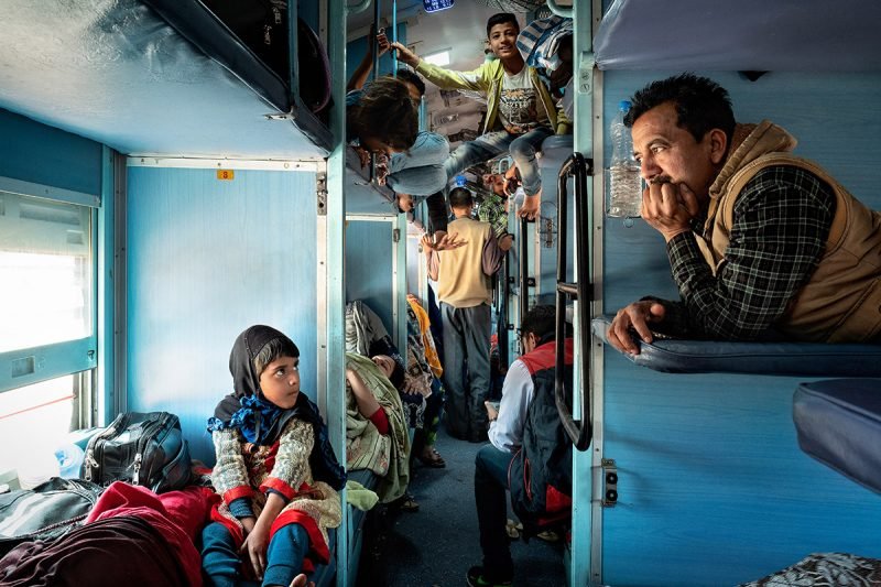 Per alcune ore, il vagone diventa la loro casa. Alcuni di loro stanno riposando sui sedili e sembrano immersi nei loro