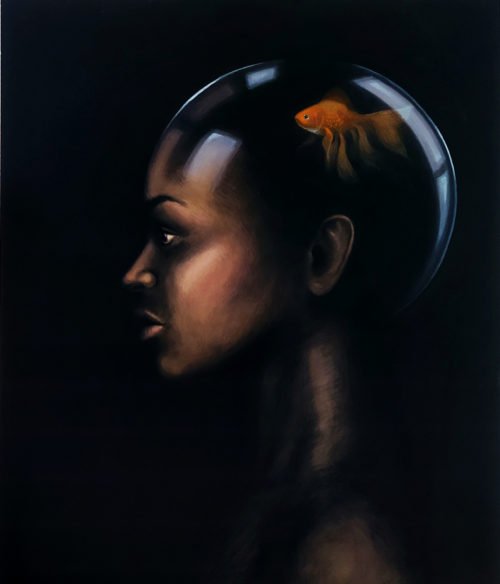 Lo fa con immagini stravaganti generate dall’innesto di vari elettrodomestici nelle teste (nella mente) delle dame del Pollaiolo creando così un anacronismo lampante, ma anche con la rappresentazione di pesci (pensieri) immersi all’interno o all’esterno della “boccia” cranica di donne contemporanee, oppure con ritratti maschili trasformati dall’inserimento di marchingegni casalinghi in “soldatini”.
