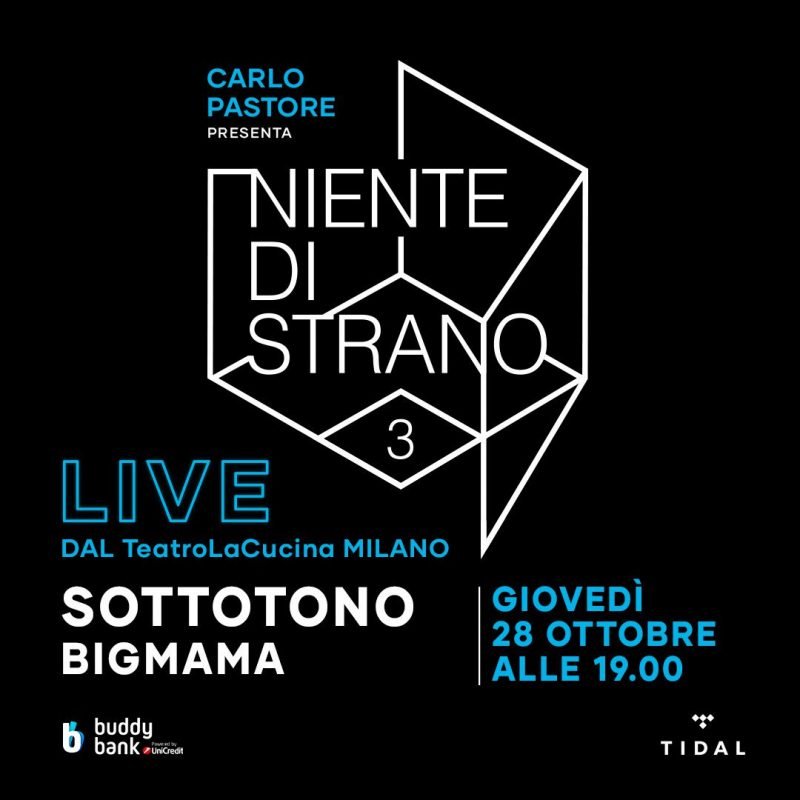 Anche in questa edizione di “Niente di Strano” si conferma la partecipazione di Carlo Pastore come conduttore e la regia di Pepsy Romanoff e Andrea Folino per i sei appuntamenti, che prenderanno il via giovedì 28 ottobre, con le performance dei Sottotono come main artist e l’opening di BigMama. Gli appuntamenti continueranno dall’11 novembre, ogni giovedì fino al 9 dicembre, per un totale di sei concerti live.